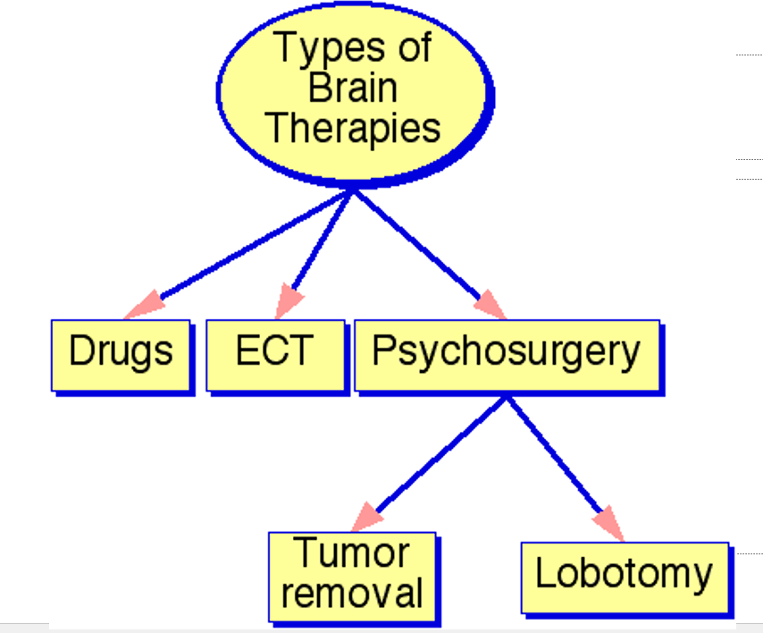a. Chemically changing the the brain's using drugs/medications--Commonly used to treat depression, anxiety, and to reduce symptoms, such as hallucinations, that people with schizophrenia may have.