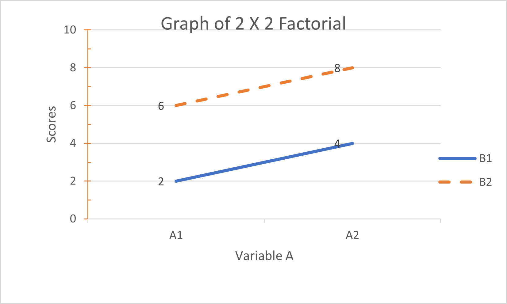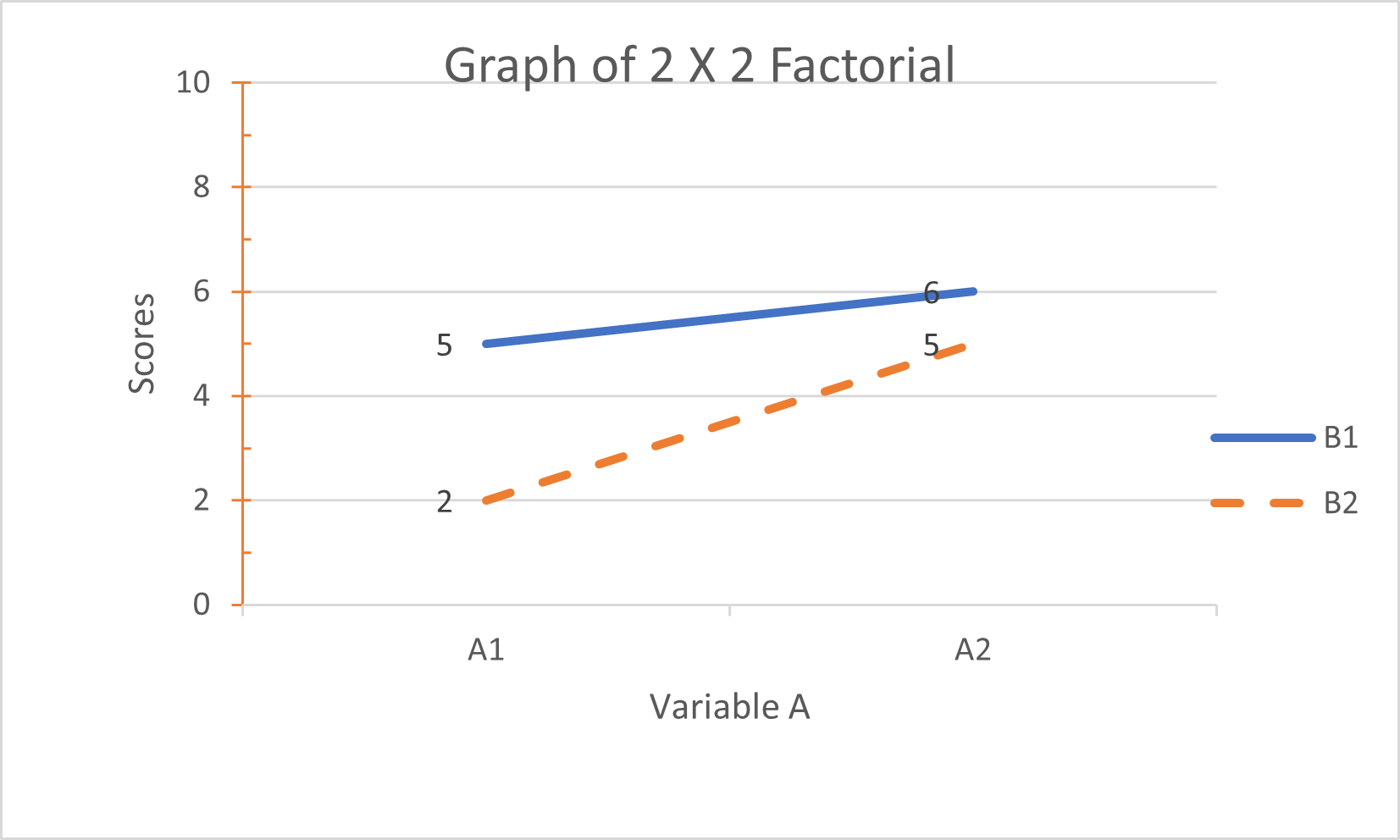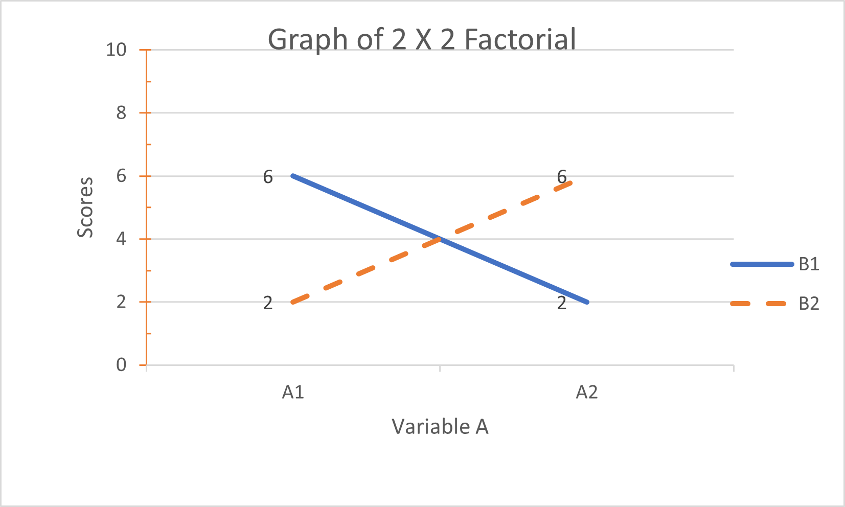 Note that the lines cross over because the effect of going from A1 to A2 in condition B1 is the opposite